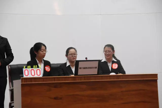 本次决赛共分为三个比赛环节。第一环节为法律知识比拼,题型为必答题,各参赛队伍按照抽签顺序依次上场。非法本专业选手们对法律基础知识的把握在本环节得到了充分的体现。第二环节为谁与争锋,题型为抢答题。此环节中,选手们积极抢答,现场气氛紧张而不失活跃。第三环节为争议焦点辩一辩,参赛队伍被分为三组,依据案例焦点进行辩论。该环节中,选手们观点明确、逻辑思维清晰,赢得了评委老师的一致好评。