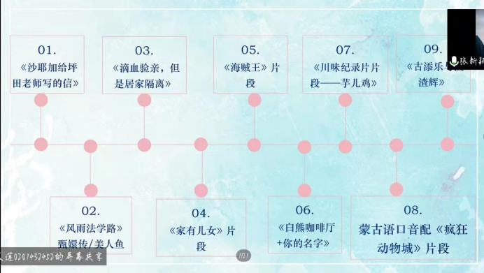 本次比赛共有九组选手,选手们采取了线下自行配音剪辑并整合视频的方式。为我们带来了以普通话、方言、蒙古语、日语为基础的一系列精彩的配音展示。