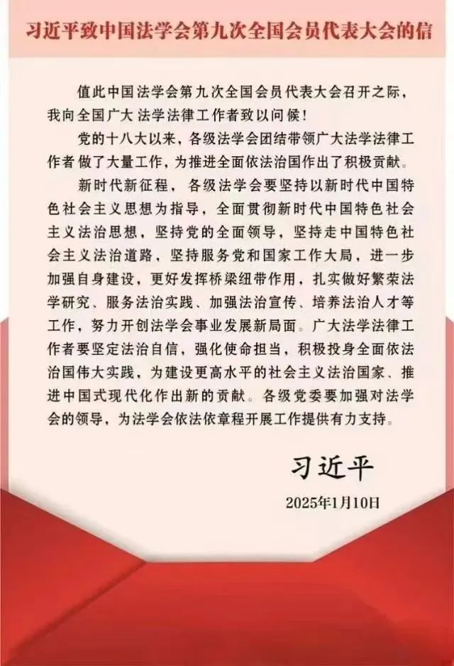 2025年1月10日,中国法学会第九次全国会员代表大会在北京召开。中共中央总书记、国家主席、中央军委主席习近平致信大会,向全国广大法学法律工作者致以问候,并对做好法学会工作提出希望。习近平总书记重要致信立意高远、思想深邃,为做好新时代新征程法学会工作指明了前进方向,提供了根本遵循。