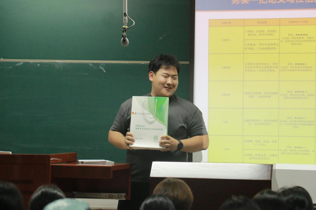 张慧春副院长则重点介绍了学院科研情况,包括学院科研成果展、学院科研支持体系,并鼓励同学们积极参与科研活动,提升专业知识和实践能力。