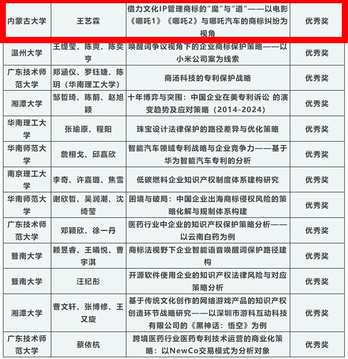 近日,由广东省法学会知识产权法学研究会、广州市知识产权研究会联合主办,华南理工大学BB贝博艾弗森官方网站(知识产权学院)、华南理工大学国家知识产权人才培训(广东)基地、华南理工大学国家知识产权信息服务中心以及华南理工大学知识产权协会联合承办的全国第二届知识产权管理案例分析大赛评选结果揭晓,BB贝博王艺霖(2022级法学2班)的论文《借力文化IP管理商标的“魔”与“道”——以电影<哪吒1><哪吒2>与哪吒汽车的商标纠纷为视角》获优秀奖。