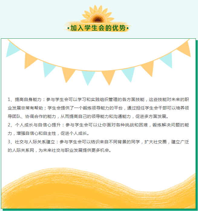 加入我们可以学习掌握多种办公软件如Excel、Word等应用技能,提前积累办公室工作经验;结识到获奖的优秀学长学姐,与他们一起交流学习心得,探讨学习经验,从中探索出适合自己的学习方法;同时还能帮助大家提升耐心、增强组织协调能力、实践能力和沟通能力,提高个人综合素质。