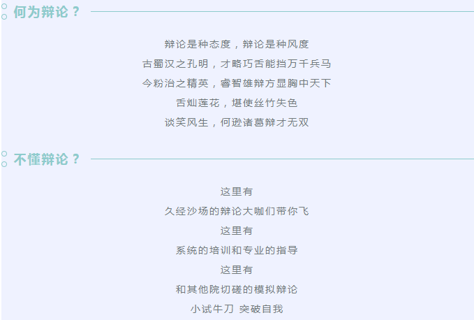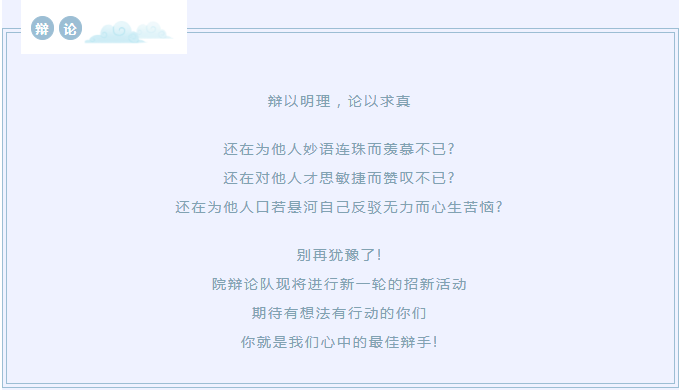加入BB贝博艾弗森官方网站辩论队,从此不用再为二课分与综测分发愁,我们组织的各类辩论赛都能够助你完成二课分的指标,如果在大型比赛中夺冠获奖,更是能够拿到宝贵的综测加分机会哟。