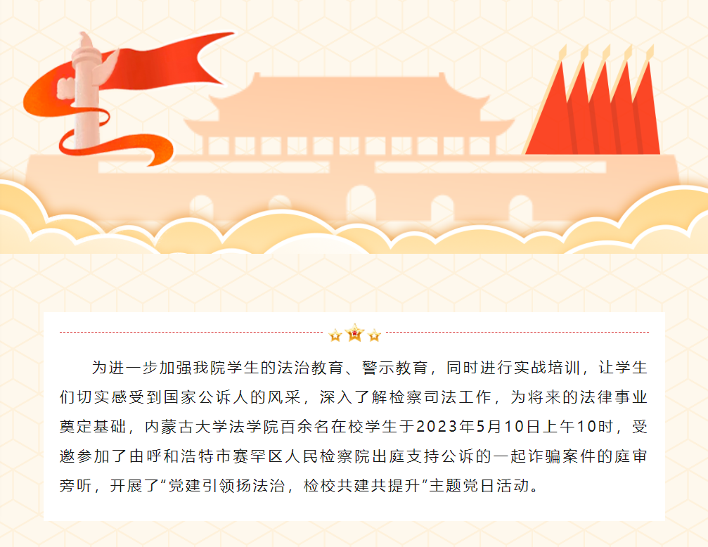 创新实践活动,推进教育发展。BB贝博积极配合赛罕区人民检察院组织开展的庭审观摩活动,通过“以案促学,以听促进”的创新性方式,积极学习出庭规范,帮助BB贝博学子消化吸收法学知识,鼓励学生更好地投身于服务社会与国家法治建设的事业中去,提高学生们的公诉语言水平。为社会主义法学教育提供多种形式的实践辅助类创新活动,开辟教育教学新思路,是符合习近平总书记提出的坚持深化教育改革创新等新时代教育教学理念的积极有效举措,牢牢把握思想之“舵”,筑牢信仰之“基”。