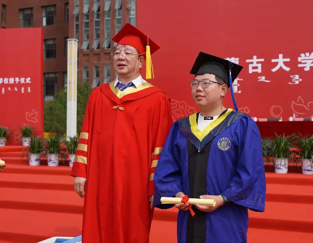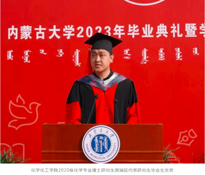 化学化工学院2020级化学专业博士研究生高瑞廷代表研究生毕业生发言。他分享了在内大求学的成长感悟,表达了对母校的感恩与不舍之情。他说,未来山高路远,未来仍需砥砺前行。站在新时代的潮头,我们需要时刻牢记时代使命,勤学笃行、担当大任。愿我们都能在变化的时代潮流中不断涵养品格,积极进取,踵事增华。
