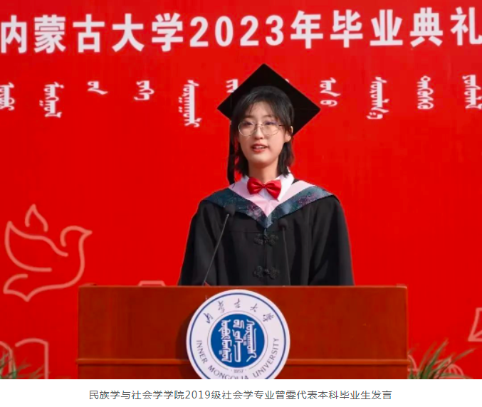 民族学与社会学学院2019级社会学专业曾雯代表本科毕业生发言。她回顾了和同学们一起走过的四年难忘的大学时光。她表示,走出校门后,大家会逐渐认识自己的胆怯和懦弱、平凡和中庸、闪光和骄傲,并逐渐接纳或修正他们,从而更好地应对外界的变迁,逐渐有能力理解社会的运作逻辑和世间的酸甜苦辣。她相信同学们毕业后必定会跨万重山、让轻舟过、品人间苍生,向祖国交出满意的答卷。