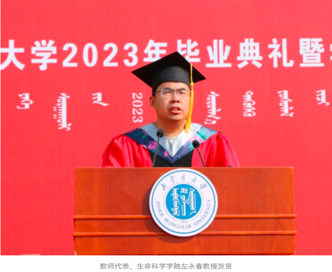 教师代表、生命科学学院左永春教授作了发言。他说,生命是地球区别于宇宙中其它行星最灵动的存在,生命的语言告诉我们:每一个生命都拥有独一无二的基因组,每个人也都有属于自己的时刻表。你无法预知属于自己的时刻何时到来,但请你乐观、积极的鼓起勇气启程。凡有启程,就有远方!他希望同学们能够像草原的向日葵一样,朝着太阳生长,怀揣“崇尚真知、追求卓越”的内大梦,做一个温暖的内大人,心存善念,向阳而生。在未来自己存在的地方,牢记习近平总书记“要志存高远、脚踏实地,学好知识,打好基础,增长才干,将来为中华民族伟大复兴贡献自己的智慧和力量”的深切嘱托,成为一束光,照亮世界的一角。