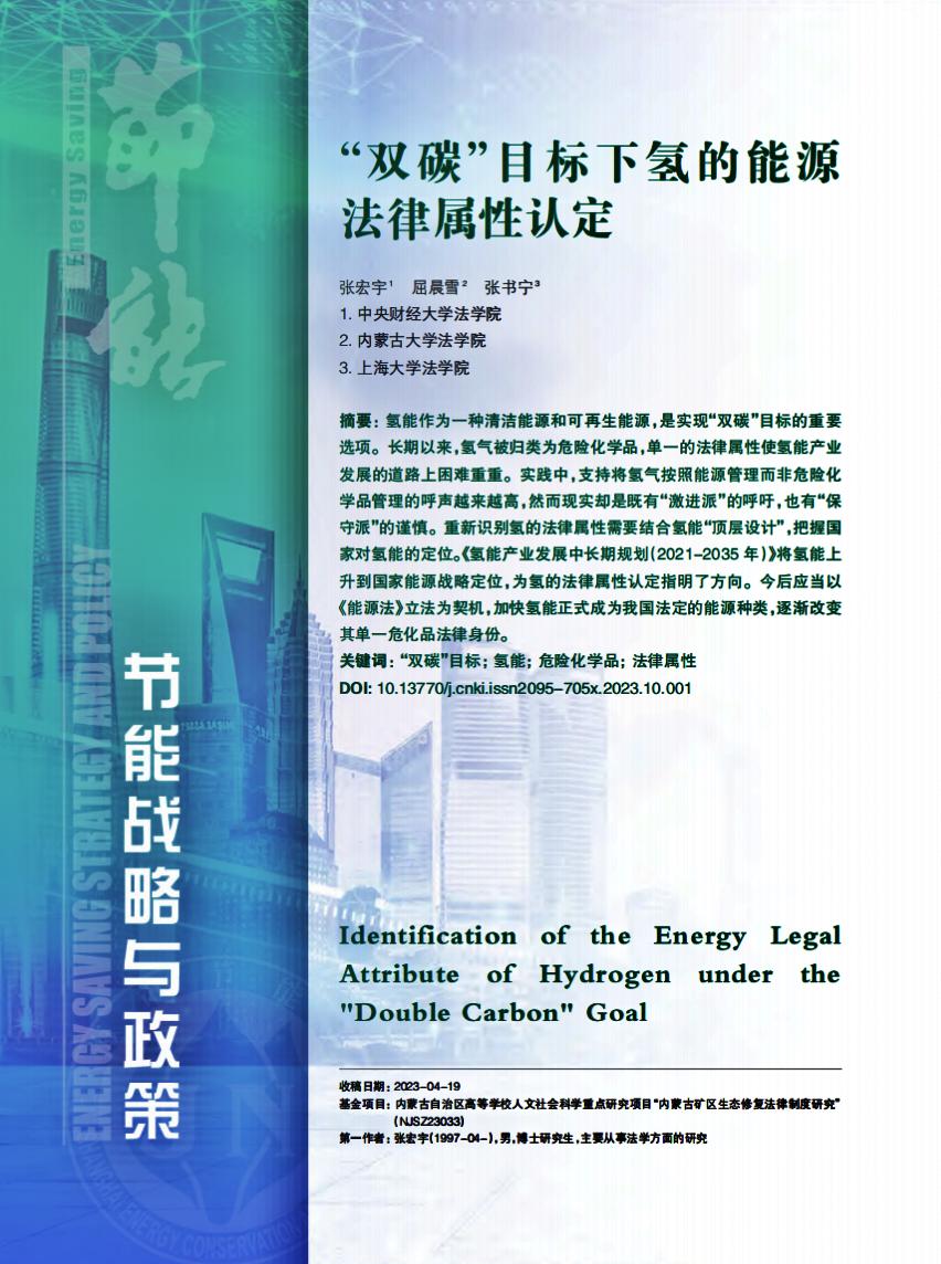 据悉,第六届全国“绿能杯”高校法学研究生暑期调研竞赛中BB贝博艾弗森官方网站代表队撰写的学术论文《“双碳”目标下氢的能源法律属性认定》在《上海节能》2023年第10期刊发。BB贝博艾弗森官方网站2020级法学硕士张宏宇为论文第一作者(现中央财经大学BB贝博艾弗森官方网站博士生),2023级法学硕士屈晨雪和2019级本科生张书宁(现上海大学BB贝博艾弗森官方网站硕士生)为共同作者。该研究得到了内蒙古自治区高等学校人文社会科学重点研究项目“内蒙古矿区生态修复法律制度研究”(NJSZ23033)的支持。