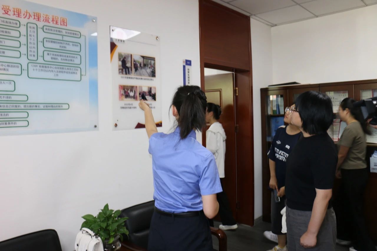 在检察院工作人员的带领下,同学们参观了12309检察服务中心和办案区,通过工作人员的介绍,同学们对检察院各部门的工作内容和流程有了基本了解。在与工作人员的积极交流中,同学们感受到了检察工作背后的温度与情怀。