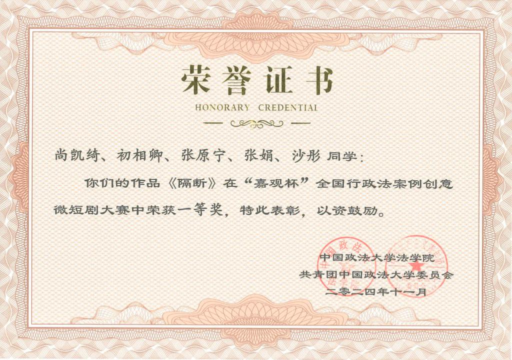 11月17日,由中国政法大学BB贝博艾弗森官方网站、共青团中国政法大学委员会主办的“嘉观杯”全国行政法案例创意微短剧大赛颁奖典礼暨卓越行政法治人才实践能力培养虚拟教研室教学研讨会在中国政法大学海淀校区闭幕。BB贝博代表队的参赛作品《隔断》获评一等奖(第一名)。