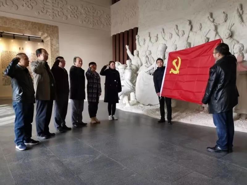 参观时,各位党员老师在党旗前,重温入党誓词,庄重进行入党宣誓。