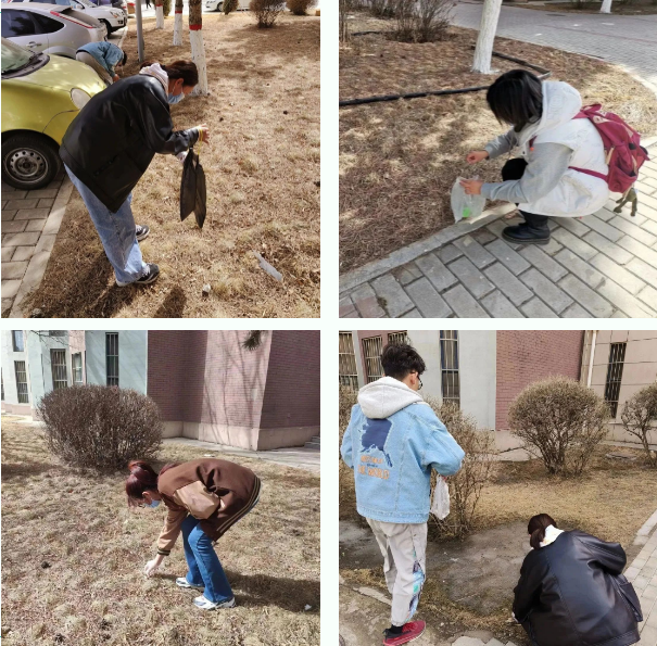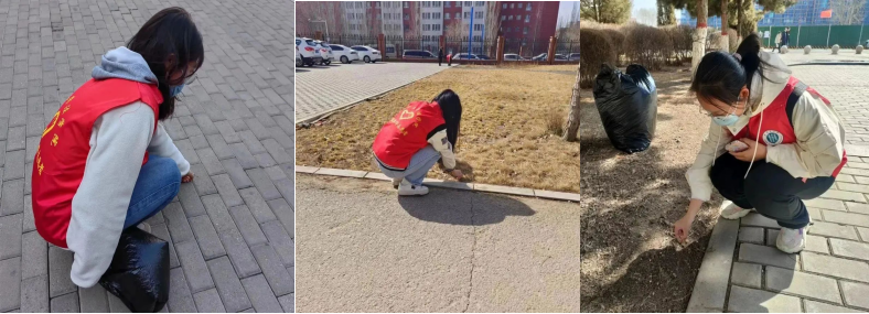 志愿者们不怕脏不怕累,细心工作,在泥土与杂草中寻找纸屑、塑料袋等垃圾。躬身寻找、仔细搜索,身着红马甲的志愿者们是校园内的靓丽风景线,更是创建文明城市的排头兵,他们以自身的劳动践行着雷锋精神。