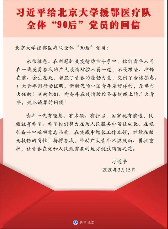 习近平总书记在给北京大学援鄂医疗队全体“90后”党员的回信中写道:“广大青年用行动证明,新时代的中国青年是好样的,是堪当大任的!”这让全国高校青年师生倍感振奋、备受鼓舞,激励着广大青年勇挑重担,为打赢疫情防控阻击战贡献力量,让青春在党和人民最需要的地方绽放绚丽之花。