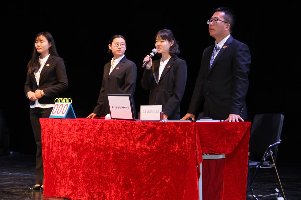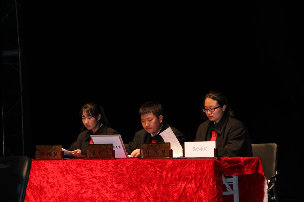 各组选手进行自我介绍后,开始第一环节:法律知识比拼,分为必答题和抢答题两个部分。在必答题环节中,选手们充分展示了扎实的法律知识基础,稳扎稳打;在抢答题环节中,现场选手们争分夺秒,场面激动人心。第二环节为案例分析挑战,选手们将对不定义选择和案例进行分析。非法学专业选手对法律问题的分析丝毫不逊色,考虑周全、条理清晰。第三环节为模拟庭审。各组选手分饰法官、公诉人、辩护人三个角色,对热点案例“于欢”案和热播剧《人民的名义》中的虚拟案例展开分析、辩论。