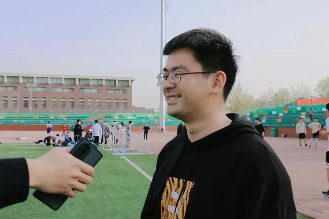最后一位接受采访的是参加男子100米的韩江雪同学。谈及初衷,他表示自己本科期间曾报名参加过径赛,后受疫情影响身体素质下滑,加上这是自己学生时代的最后一次运动会,希望能够取得一个好的成绩为此画上圆满的句号。他也提到自己会在接下来的日子中抽出时间每天按时完成训练,提高身体素质,以比赛为契机逐渐恢复锻炼的习惯,不求比赛结果,只求赛出风格。