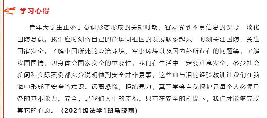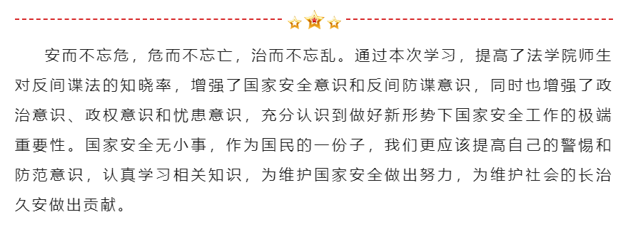 经过学习和交流,我们对于国家安全有了深刻的了解,对相关的法律法规也有了较为清晰的认识。在学习和讨论中我们踊跃发言,并认真记录了自己的学习过程、撰写了自己的心得体会。不仅丰富了我们的的课余生活,增长了知识,更激发和培养了学生的爱国主义热情。同时,在全体学生中营造了国家安全,人人有责的氛围,为国家安全稳定工作莫定了良好的基础。