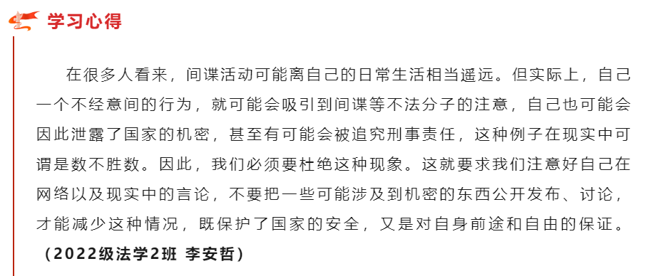 2022级各班级通过引导同学们查阅并学习电子版的《中华人民共和国国家安全法》《中华人民共和国反间谍法》来加深对国家安全、反间防谍的认识。通过实践学习,进一步增强青年大学生的国家安全意识和反间防谍意识,更好地推动深入贯彻落实总体国家安全观,切实维护国家安全利益,筑牢维护国家安全的人民防线,推动形成维护国家安全的强大合力。