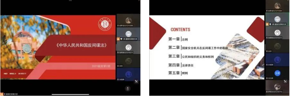 2021级的2个班级通过召开线上会议的方式开展反间谍宣传教育学习,带领同学们观看有关国家安全内容的、反间谍性质的教育宣传视频以及图文资料,组织同学们查找有关法律规定,进行讨论,相互学习,使全体同学对反间谍相关知识有了比较全面和正确的认识。通过此次学习,不仅增长了同学们的相关法律知识,了解到触犯国家安全条例的危害,还提高了学法、懂法、守法、用法意识,增强了全民国家安全责任。