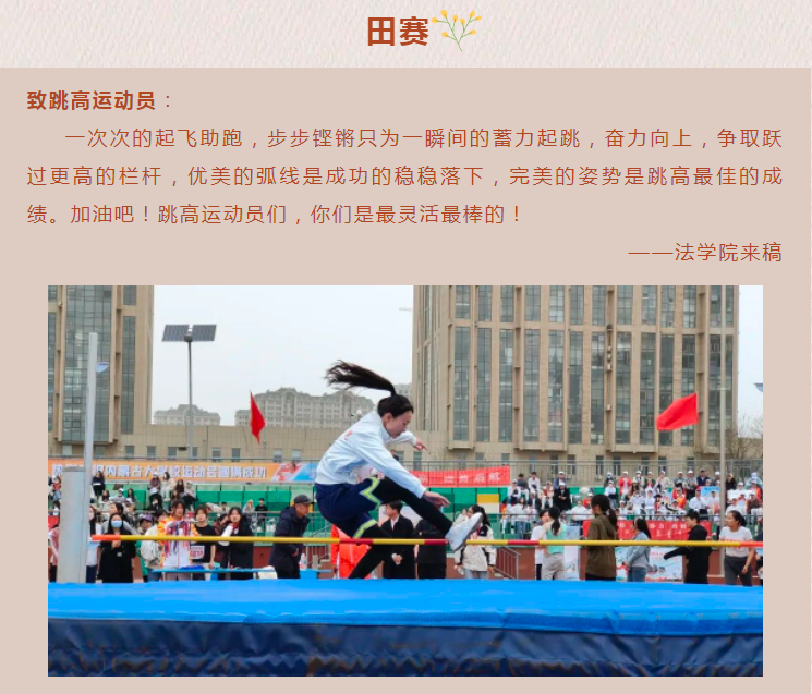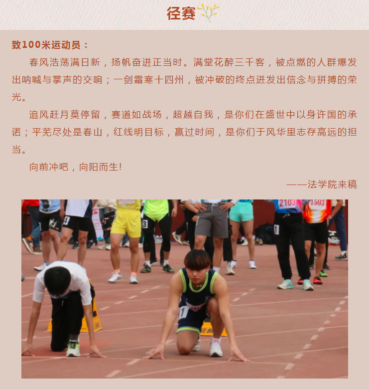 物有甘苦,尝之者识;道有夷险,履之者知。你们将青春的汗水融入在红色的跑道上,将时间付诸于心中的理想,往日的勤于苦练今日以骄阳评判。那声哨响便拉开了帷幕,秉着胜利当仁不让的原则,如箭在弦飞刺而出。哪怕鲜红之路漫漫,也抵不住上下求索之毅力,咬紧牙关坚持的一分一秒,都在谱写青春最美好的颜色。