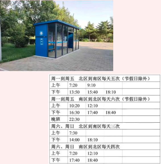 1.校车位于卓越楼东侧和篮球场之间,可以方便大家来往于南北校区。乘坐校车需支付2.5元,可刷校园卡或直接支付现金,但是不可以使用微信和支付宝哦