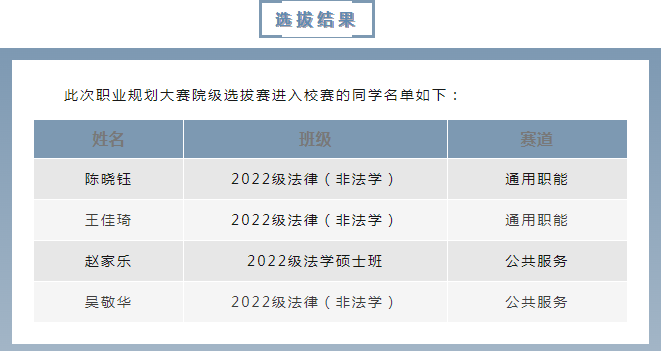 通过全国大学生职业规划大赛,同学们进一步明确了职业发展目标,树立了正确的成才观、择业观和就业观。通过参加这次比赛,参赛选手能从目标选择、职业实现、具体路径、个人价值与社会需求等角度进行择业、就业,达到了比赛举办的预期效果,做到了以赛促教、以赛促就。
