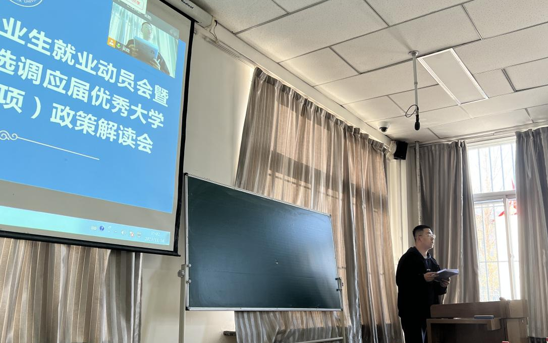 为深入贯彻习近平总书记对加强和改进选调工作的重要指示精神,让优秀人才更好助推内蒙古自治区法治社会发展,2023年11月14日下午,学院采用线上、线下相结合的方式,组织召开了《内蒙古自治区2024年度到BB贝博艾弗森官方网站选调应届优秀大学毕业生公告(政法专项)》政策解读会议。会议由学院就业专职辅导员吴晗老师主持,BB贝博艾弗森官方网站及满洲里学院2022-2024届的230余名同学参加此次会议。