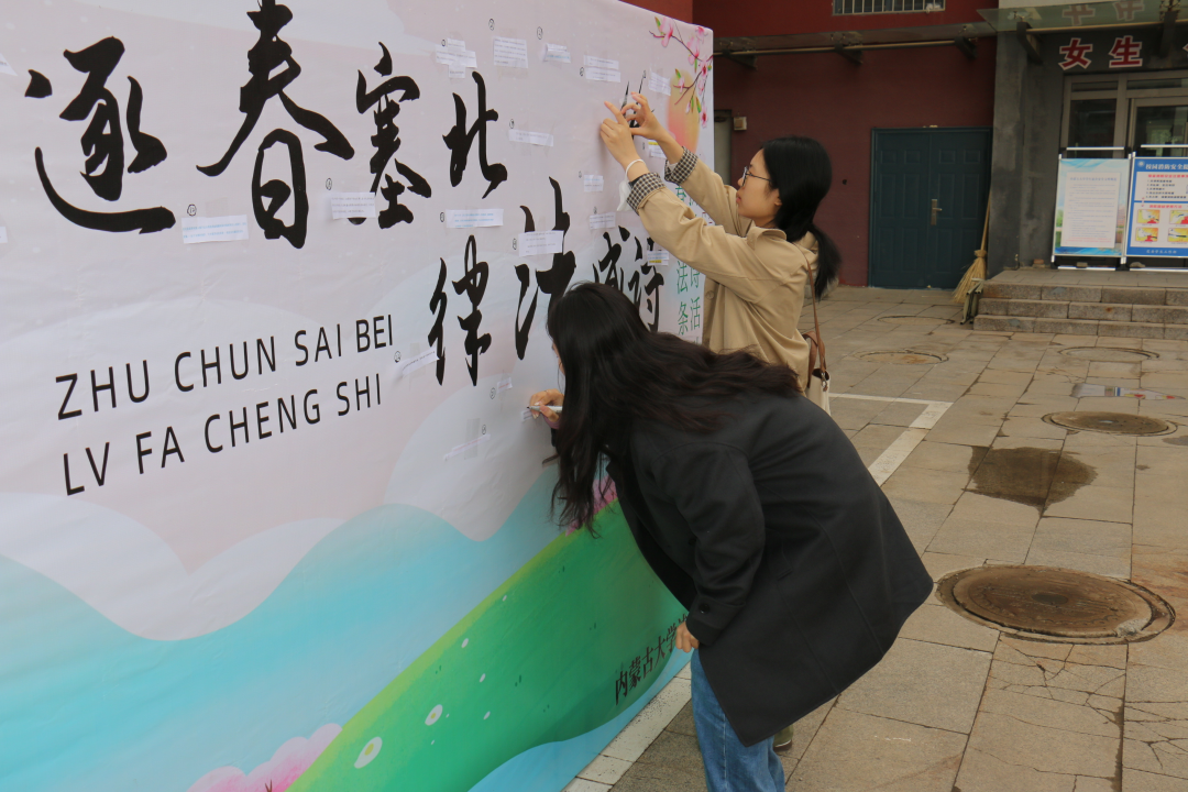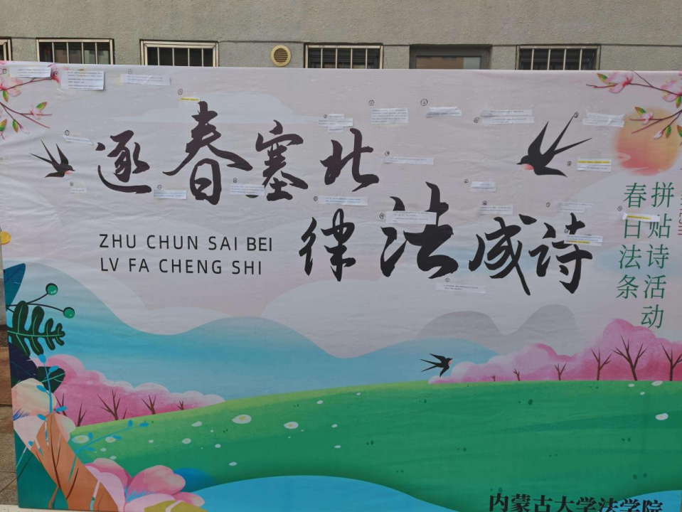 为了进一步宣传法律知识,提升同学们的文学素养,激发大家对法律的学习热情,BB贝博于4月14日9:00在玉泉校区西院3号学生公寓楼下举办“逐春塞北 律法成诗”——春日法条拼贴诗活动。