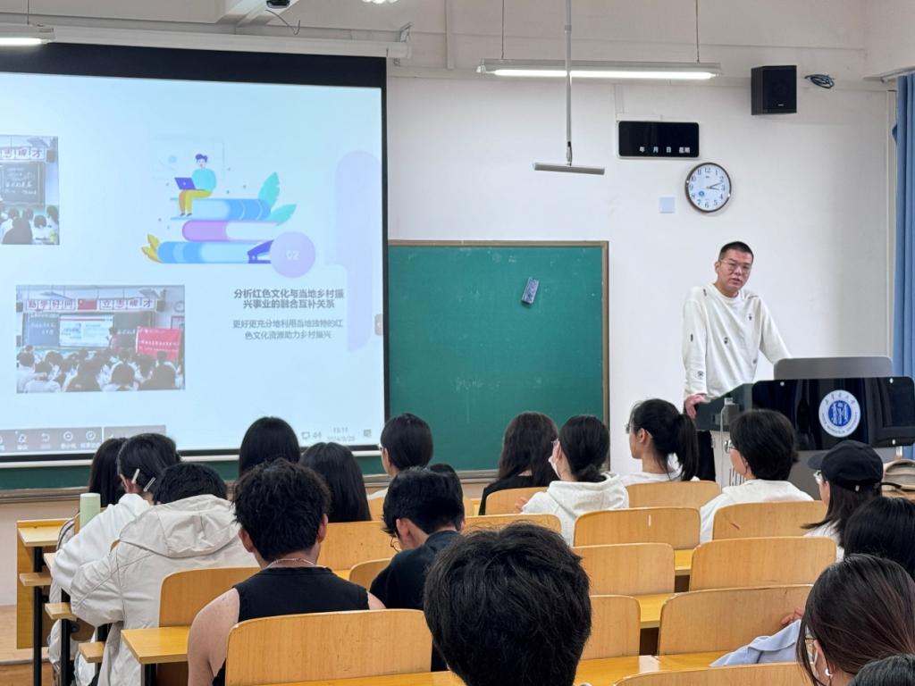 红色引擎队的负责人赵娅琪同学向同学们详细介绍了“三下乡”活动的前期准备工作、具体活动安排、实践收获和申请方式等内容。团队成员高耀凯同学分享了他们在山西省长治市武乡县参观八路军纪念馆并开展志愿服务活动、在当地小学入校宣讲、充分利用当地独特的红色文化资源助力乡村振兴的经历。