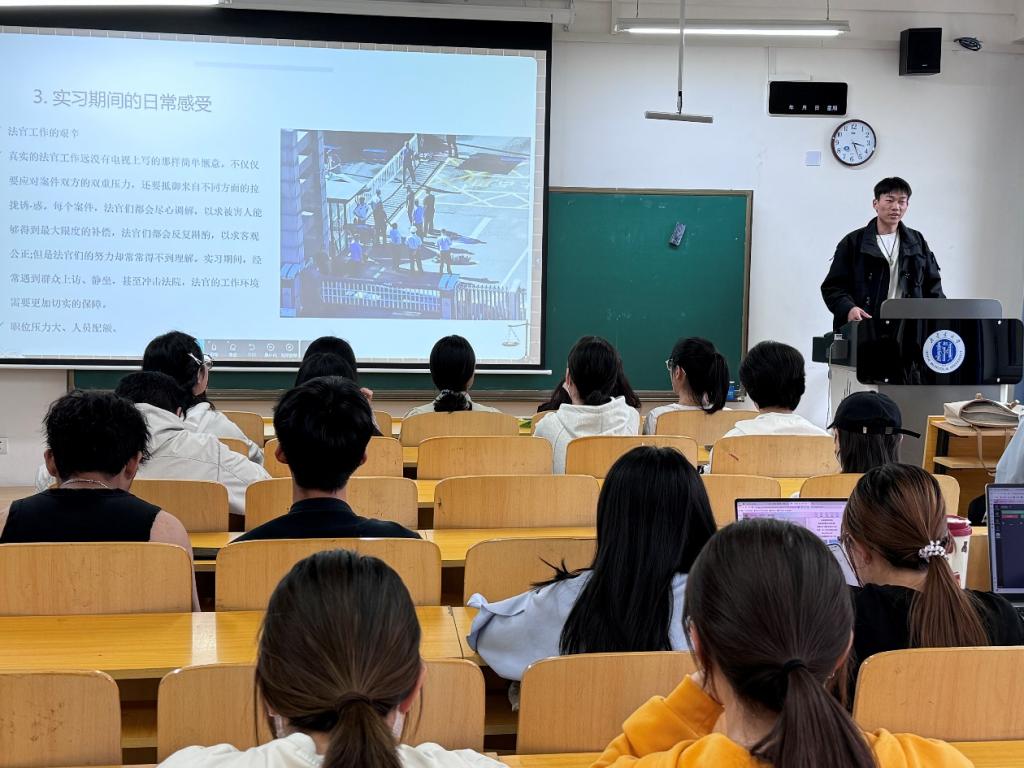 樊佳伟同学详细分享了她先后在清水河县人民法院立案庭和行政岗实习的经历。整理卷宗、送达文书、校对文书,这些工作体验不仅让她对法律实务有了更为直观的深入理解,深刻体会到了法律工作的严谨性和规范性,也极大地丰富了人生阅历,更让她清楚的认识到法学生除了要掌握好本专业知识外,也要多多学习其他专业的相关知识。