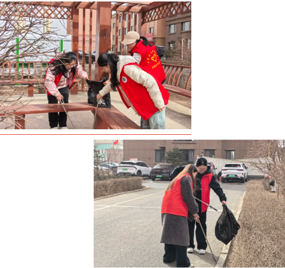 到达社区后,环保小组的同学们手持夹钳、垃圾袋穿梭于社区,躬身拾捡烟蒂纸屑,仔细分拣回收物,用青春力量打造社区绿色家园。