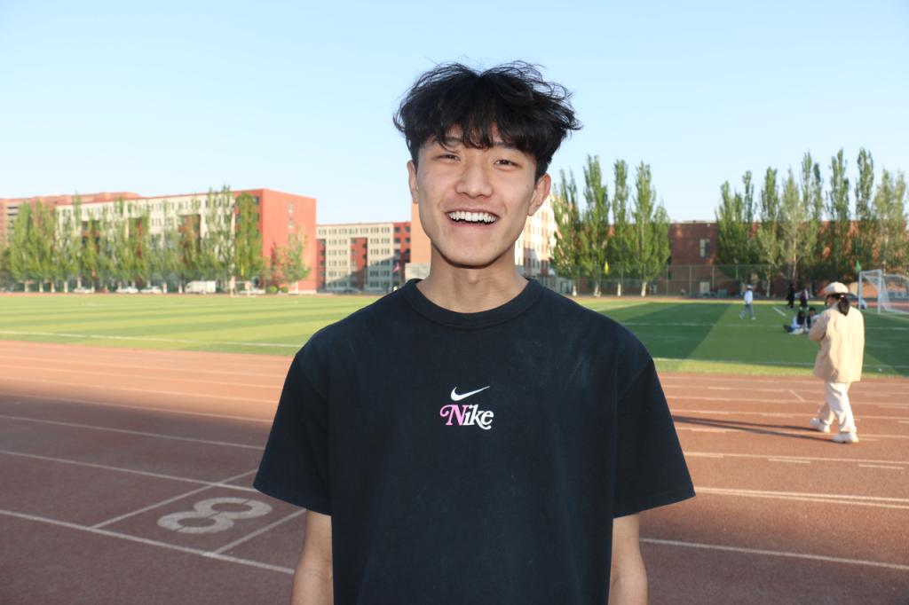 然后,我们采访了参加200米短跑、跳高和4×400米接力项目的参赛者——刑佳乐同学。谈及训练,他说到,虽然每天在跑道与跳高垫间切换,但热爱可抵艰辛。谈及比赛,他满怀憧憬:“期待在短跑中突破速度极限,在跳高项目上挑战新高度,在接力中与队友并肩冲线,用拼搏为青春添彩!”