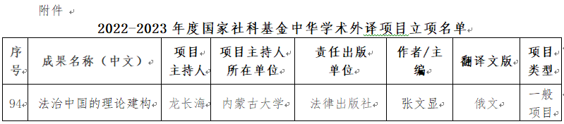 2023年5月5日,全国哲学社会科学工作办公室公布了2022-2023年度国家社科基金中华学术外译项目立项名单,本次全国立项234项,内蒙古自治区获批三项,BB贝博龙长海教授申报的《法治中国的理论建构》项目获批公示,《法治中国的理论建构》一书,由我国著名的法学家张文显教授所著,由法律出版社2016年出版。