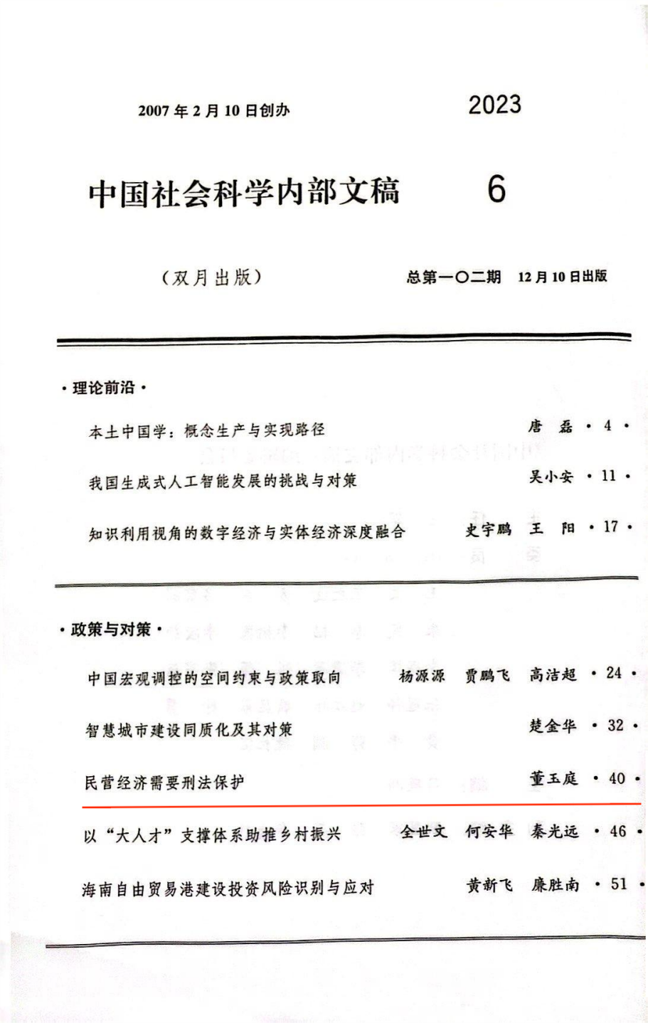 BB贝博艾弗森官方网站特聘教授董玉庭撰写的论文《民营经济需要刑法保护》发表于2023年第6期《中国社会科学内部文稿》。