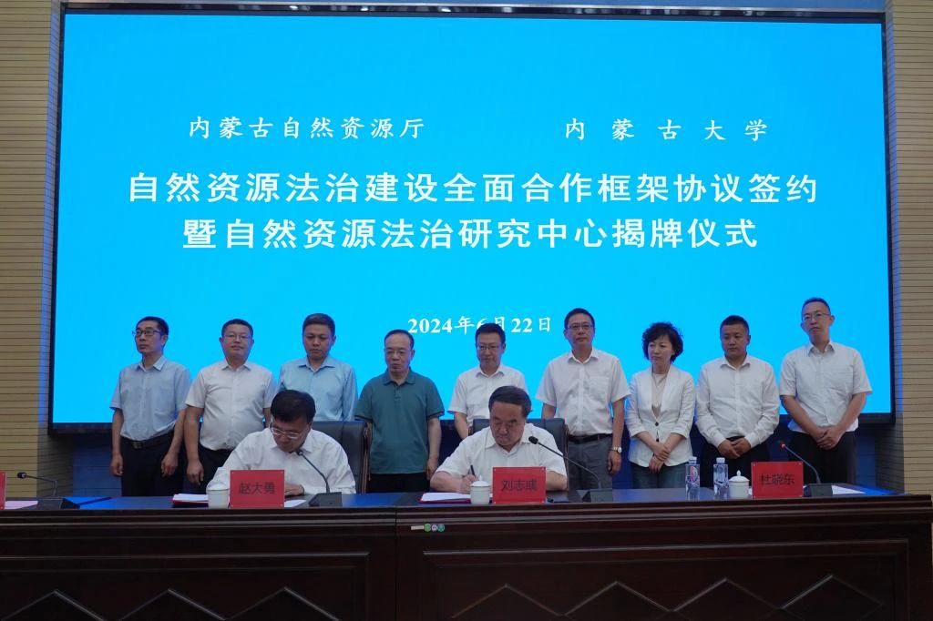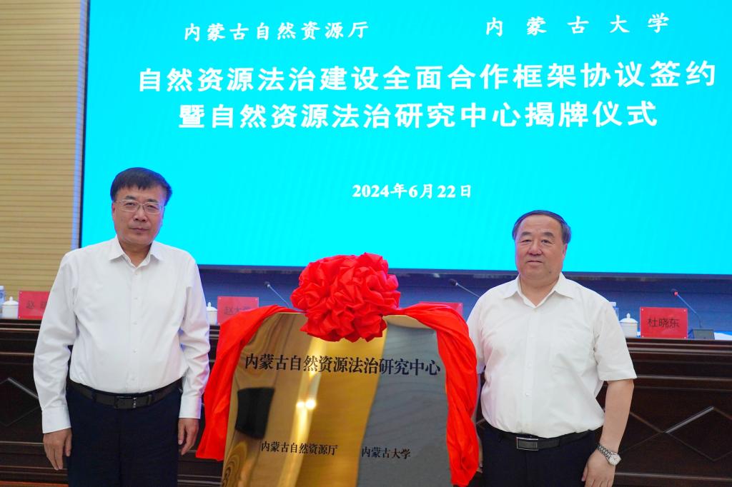 刘志彧与赵大勇签署《合作协议》,共同为“内蒙古自然资源法治研究中心”揭牌。