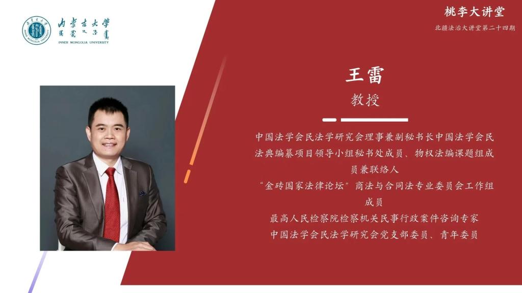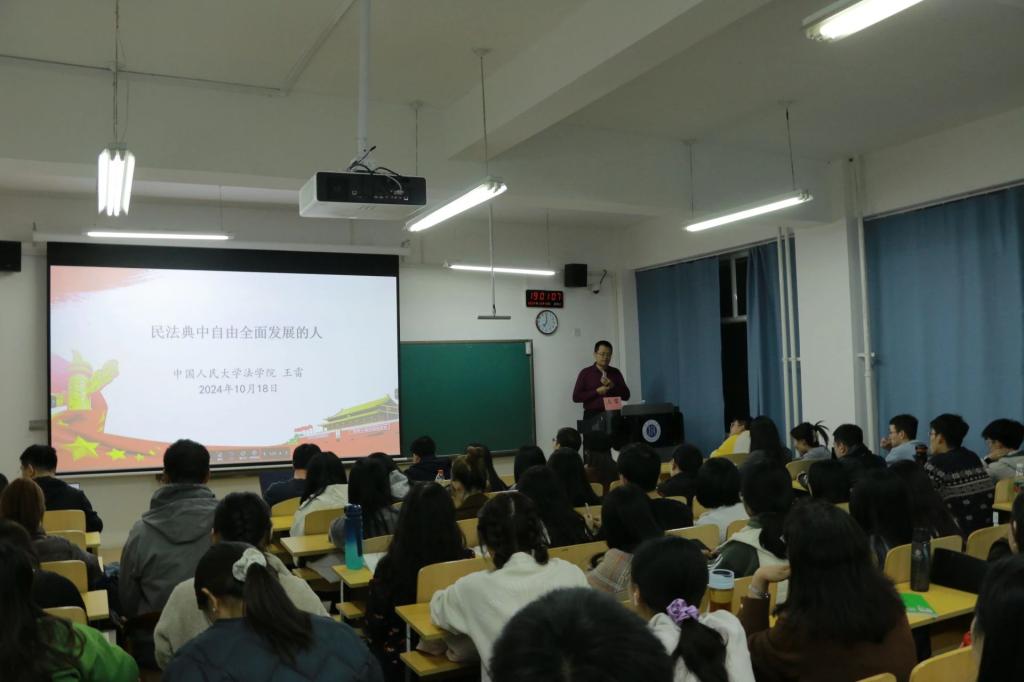 2024年10月18日,BB贝博艾弗森官方网站在玉泉校区西院创新南楼201教室成功举办第二十四期“北疆法治大讲堂”系列讲座。本次讲座的主讲人是中国人民大学BB贝博艾弗森官方网站教授、博士生导师、中国人民大学民商事法律科学研究中心研究员王雷教授,讲座的主题是《民法典中自由而全面发展的人》。讲座由BB贝博艾弗森官方网站祝之舟教授主持,内蒙古工业大学人文学院毕力格图老师、BB贝博艾弗森官方网站代琴、刘琬乔、段程旭四位老师作为与谈人出席了本次讲座,各年级本科生和研究生积极参加,反响热烈。