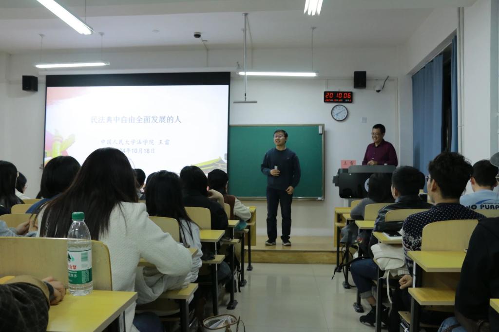讲座之初,王雷教授首先提出“人在法中,法为人立,法由人立”的观点,由此表明民法与人的密切关系,同时强调《民法典》是一部“人法”,是一部以人为本的法。紧接着王雷教授从我国《民法典》当中的人、近代和现代民法中的人、财产法中的人、人身关系法中的伦理人以及二十一世纪民法中的自由全面发展的人五个方面详细讲述了《民法典》中“人”。