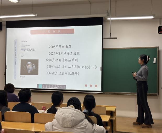 接着,李姝颖同学着重讲述了自己阅读《知识产权批判史》一书后的感受与收获。通过阅读,她对知识产权有了全新的理解,意识到知识产权的历史并非如人们通常所想的那样——中性的功能驱动朝向自然公正的“最佳”法律解决方案的改善,实际上它是一部有着深刻政治经济背景的历史。李姝颖同学还借助生动有趣的案例以及中外历史的对照比较,更加深入地阐述了该书作者的核心观点,即知识产权一直是竞争的经济利益、受政治驱动的政府和哲学传统之间的政策战场。