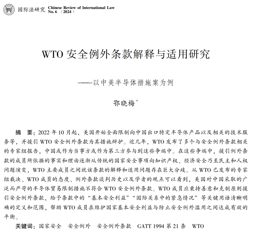 BB贝博鄂晓梅教授撰写的学术论文《WTO安全例外条款解释与适用研究——以中美半导体措施案为例》在《国际法研究》(2024年第6期)发表。