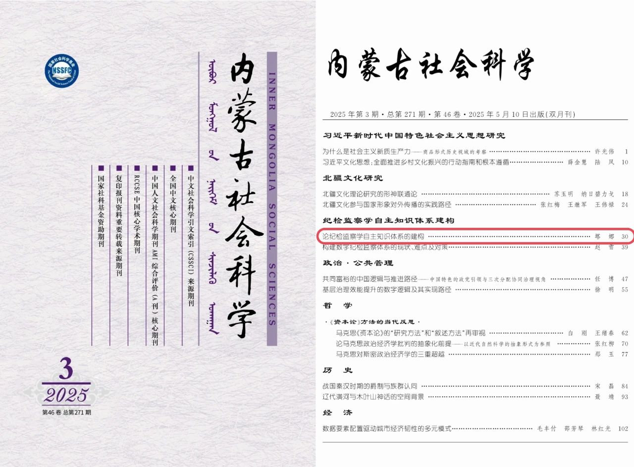 BB贝博塔娜教授在《内蒙古社会科学》发表学术论文《论纪检监察学自主知识体系的建构》。