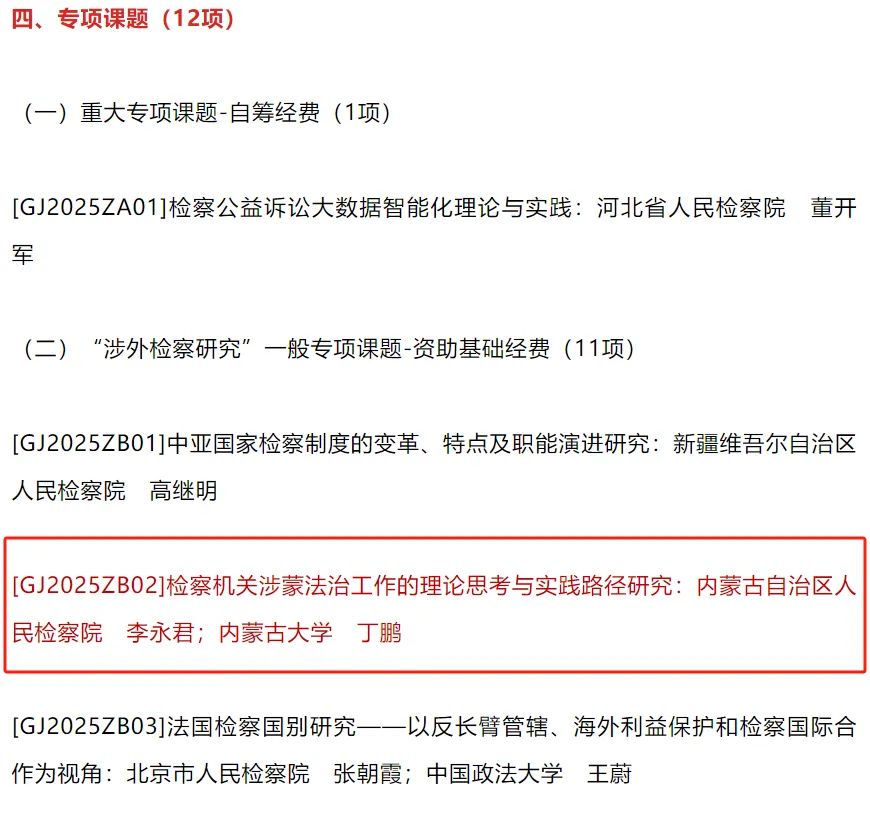 近日,最高人民检察院发布2025年度最高人民检察院检察理论研究课题立项公告。其中,内蒙古自治区人民检察院李永君、BB贝博艾弗森官方网站丁鹏《检察机关涉蒙法治工作的理论思考与实践路径研究》获专项课题立项。