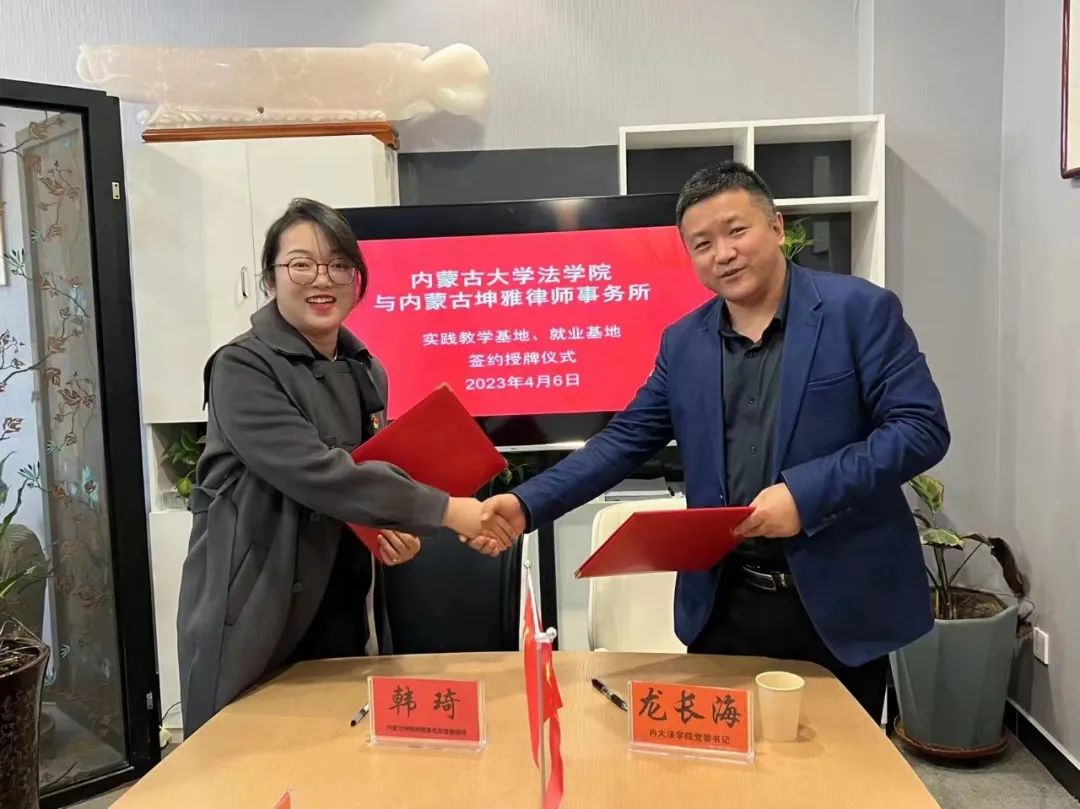 2023年4月6日上午,BB贝博艾弗森官方网站与内蒙古坤雅律师事务所共建实践教学基地、就业基地签约暨授牌仪式在内蒙古坤雅律师事务所会议室举行。BB贝博艾弗森官方网站党委书记龙长海、团总支副书记李璐、BB贝博艾弗森官方网站研究生辅导员吴晗,内蒙古坤雅律师事务所首席律师韩琦、事业部经理潘国栋、行政经理于歌出席仪式并参加座谈会研讨。