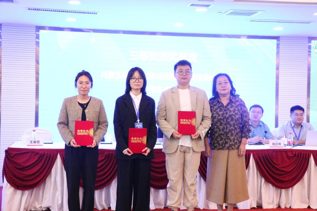 经专家评审,本次大会共评选一等奖论文五篇、二等奖论文十二篇、三等奖论文十八篇、优秀奖论文十五篇。内蒙古自治区法学会民法学研究会副会长王乐宇教授、海棠教授、杨德桥教授、唐孝辉教授以及内蒙古德沃律师事务所主任李鹏飞律师等五位颁奖嘉宾为获奖作者代表颁奖。