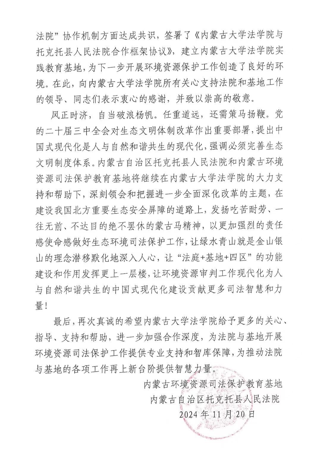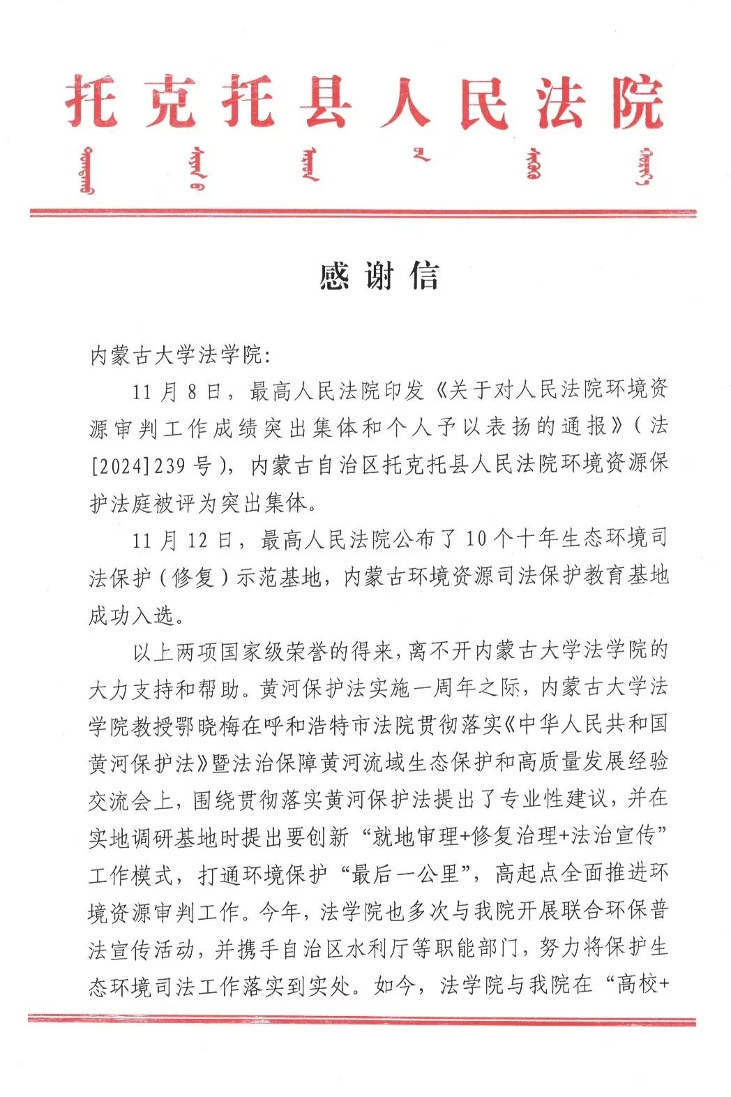 2024年11月20日,托克托县人民法院向学院发来感谢信,信中通报托克托县人民法院环境资源保护法庭被最高人民法院评为环境资源审判工作成绩突出集体、内蒙古环境资源司法保护教育基地入选10个十年生态环境司法保护(修复)示范基地,表示这两项国家级荣誉的获得,都离不开BB贝博艾弗森官方网站的支持和帮助,希望双方可以进一步加强合作,为法院和基地开展环境资源司法保护工作提供专业支持和智库保障,为推动法院和基地的各项工作再上新台阶贡献智慧力量。