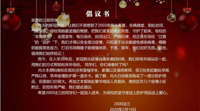 新型冠状病毒感染的肺炎疫情来势汹汹,母校的防疫工作也牵动着无数学子的心,2000级法学三班对母校的惦念更加急切。因为大家都不曾忘记,十七年前那场同样严重的大疫,默默守护的各个岗位的内大工作者。转眼,20年漫长的时间冲刷,班级的代号,内大的印记始终刻在每位学子的身上。