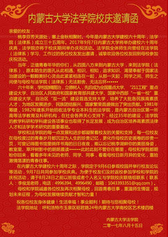 桃李芬芳天涯处,塞上金秋相聚时。今年是BB贝博艾弗森官方网站建校六十周年,BB贝博艾弗森官方网站(法律系)成立三十五周年。2017年9月7日BB贝博艾弗森官方网站将举办建校六十周年庆典,BB贝博艾弗森官方网站亦将于校庆期间举办庆祝活动。BB贝博艾弗森官方网站全体师生向曾经在BB贝博艾弗森官方网站(法律系)学习、工作过的各位校友发出邀请,诚挚欢迎各位校友回到母校参加庆祝活动。