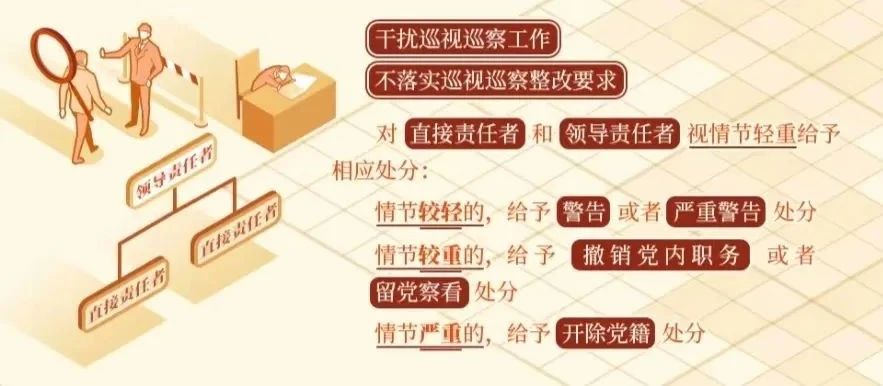 《中国共产党纪律处分条例》规定,干扰巡视巡察工作或者不落实巡视巡察整改要求,属于违反政治纪律的行为,对直接责任者和领导责任者,视情节轻重给予相应处分。情节较轻的,给予警告或者严重警告处分;情节较重的,给予撤销党内职务或者留党察看处分;情节严重的,给予开除党籍处分。