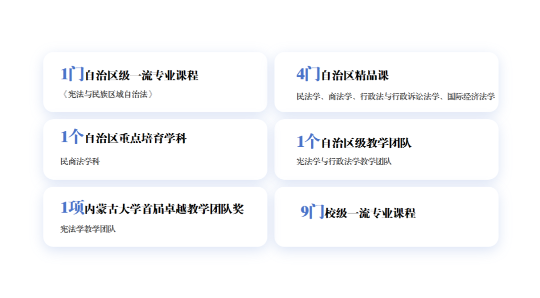 学院现有1门自治区级、9门校级一流专业课程,4门自治区精品课,1个自治区重点培育学科,1个自治区级教学团队,1个BB贝博艾弗森官方网站首届卓越教学团队。学院下设9个教研室,并设有“自然资源法治研究中心”“涉外法治研究中心”等多个研究机构。经过40多年的发展,BB贝博艾弗森官方网站已成为内蒙古自治区培养高素质法学、纪检监察学人才的重要基地和学术研究中心。